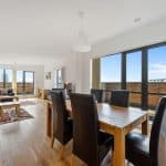 The spacious living/dining room is a real feature of this apartment, with floor to ceiling windows and doors leading to the balcony which overlooks The Royal Armouries and the River Aire. The kitchen is fitted with a range of modern units, Quartz worktops and electric range style oven and there is a further door leading to the second balcony.