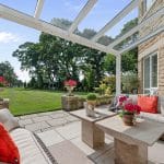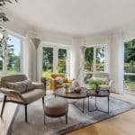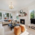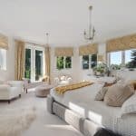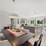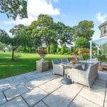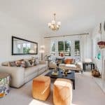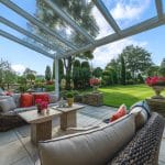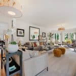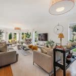 The lovely entertaining lounge enjoys a great deal of light, with three patio doors, and looks over the stunning rear garden and the Mediterranean style side garden and terracing.