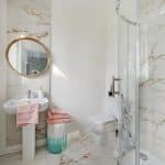 To the first floor is a generous landing with an airing cupboard. The primary bedroom suite enjoys views over the rear garden with a Juliet balcony, walk in dressing area with hanging space and an ensuite having a walk in shower/wet area, low level flush w.c. and vanity unit/wash basin with attractive tiling. There is a guest suite with ensuite and walk in hanging area. Bedroom three also has an ensuite shower room and there are two further bedrooms and house bathroom having a panelled bath, vanity unit, walk in shower/wet area and w.c.