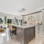 The reception hallway leads to an outstanding living/dining/kitchen which enjoys a great deal of light with views to three elevations. The kitchen area has attractive bespoke Shaker style units fitted by Tom Howley of Harrogate with quartz work surface units and central preparation/breakfast bar area. There is an induction hob with remote control extractor fan above, built in oven, separate oven/microwave and warming tray, built in larder fridge and separate freezer and dishwasher and there is underfloor heating in the porcelain tiled kitchen area and a walk in pantry store. Bifolding doors to the rear terracing and the living area has a wood burning stove and decorative ceiling.