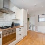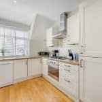 Stairs lead to the kitchen which is fitted with a range of modern cream wall and base units, complimenting wood effect worktops, an integrated fridge/freezer, a gas hob, electric oven, washer/dryer and there is a slimline dishwasher.