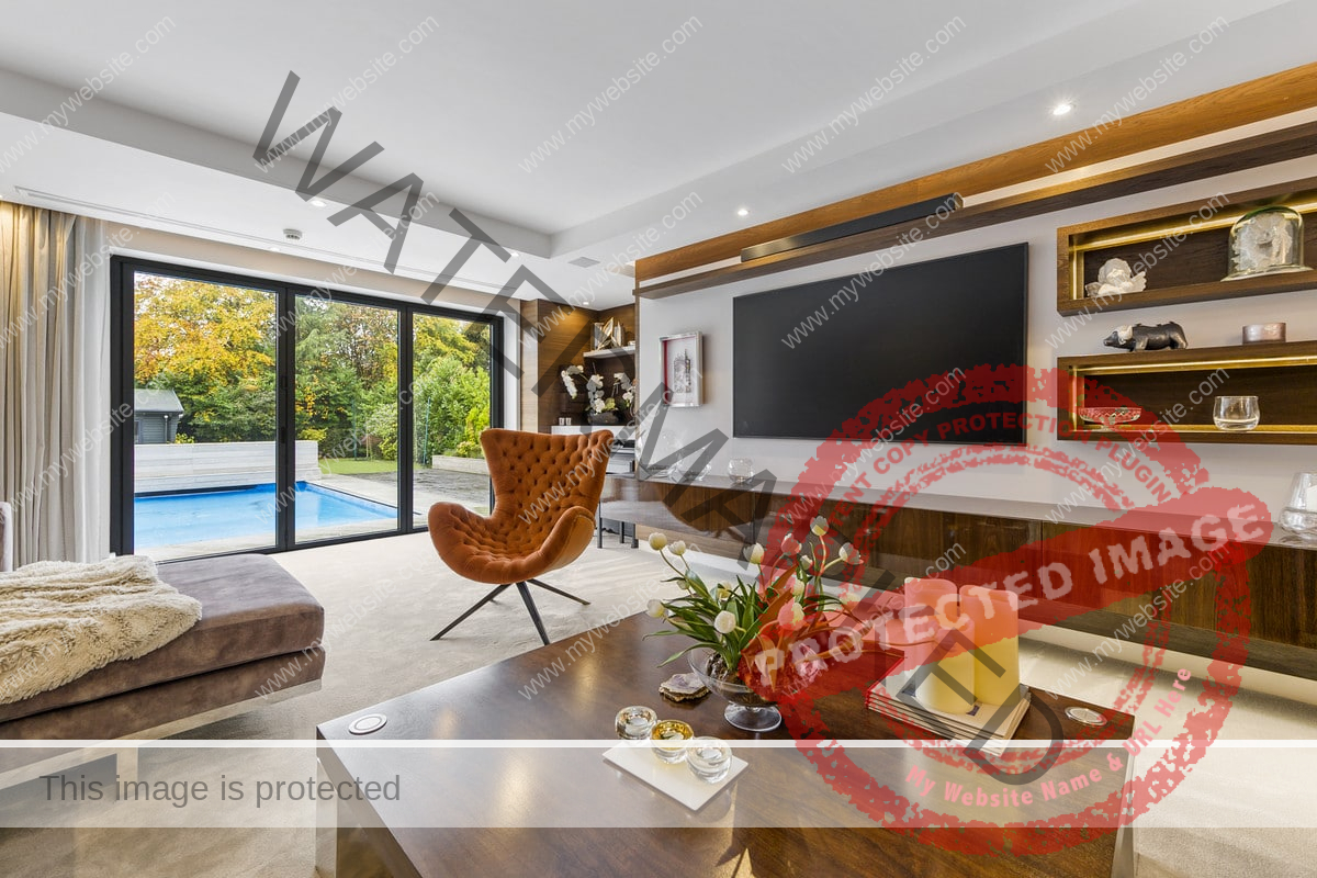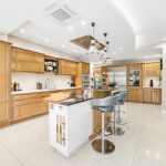 The kitchen leads to a family tv room with an imported stained Spanish oak feature wall, electrically operated blackout blinds and Bi-Fold doors lead to the rear terrace overlooking the swimming pool.
