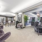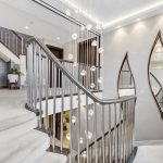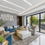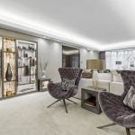 Entering into the property you will find a grand reception hall with a sweeping staircase and bespoke seating. Beneath the staircase is a cleverly concealed pocket door which can be opened up to transform the space when entertaining. 180 degree hinged doors lead to a stunning entertaining reception space with sitting area and inset illuminated display shelving.