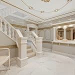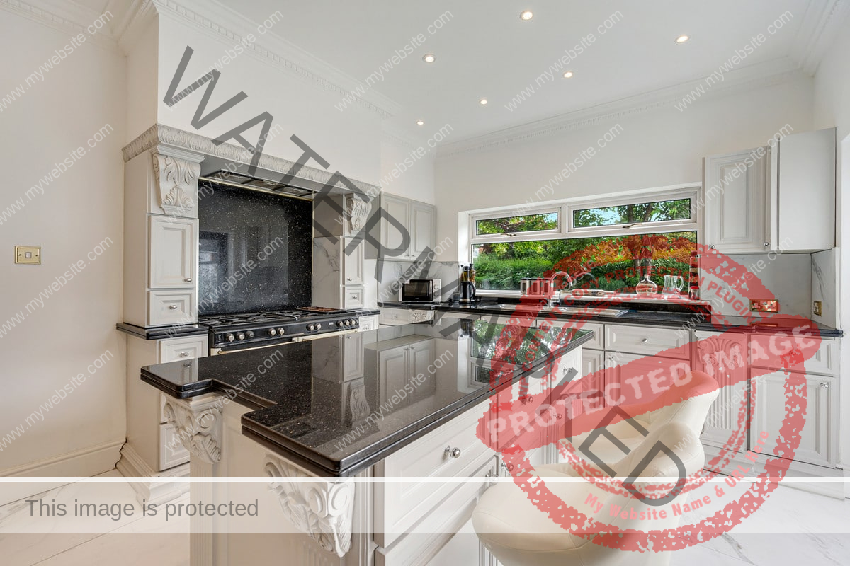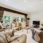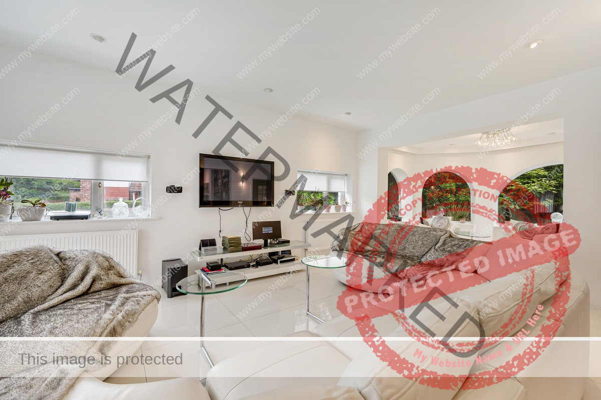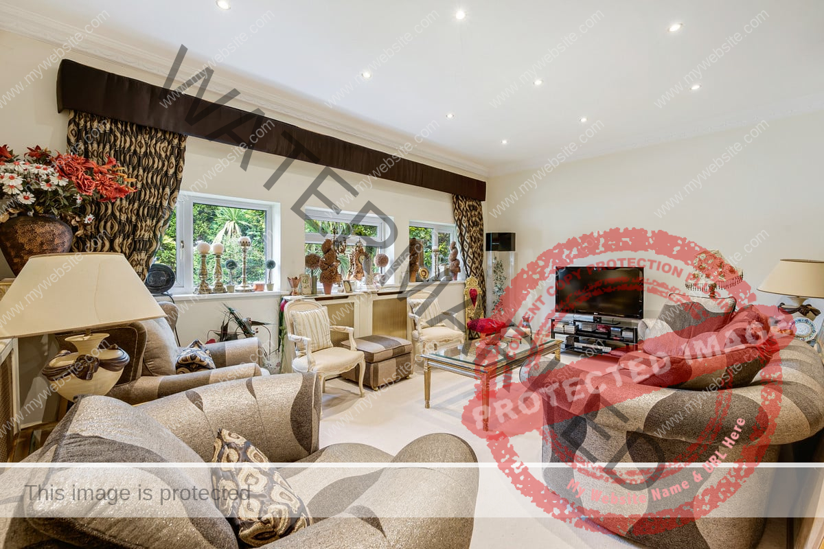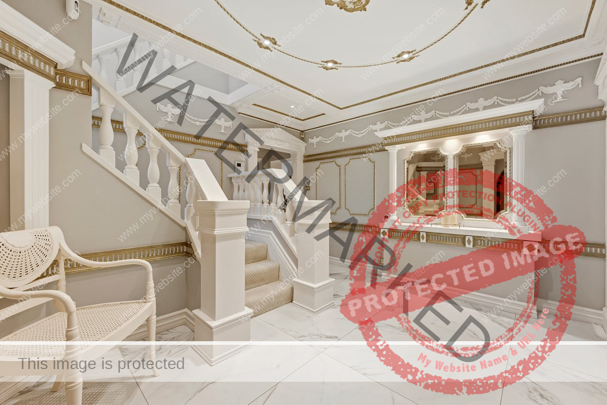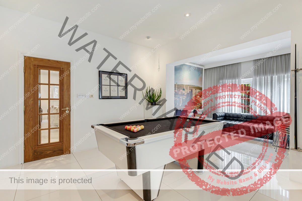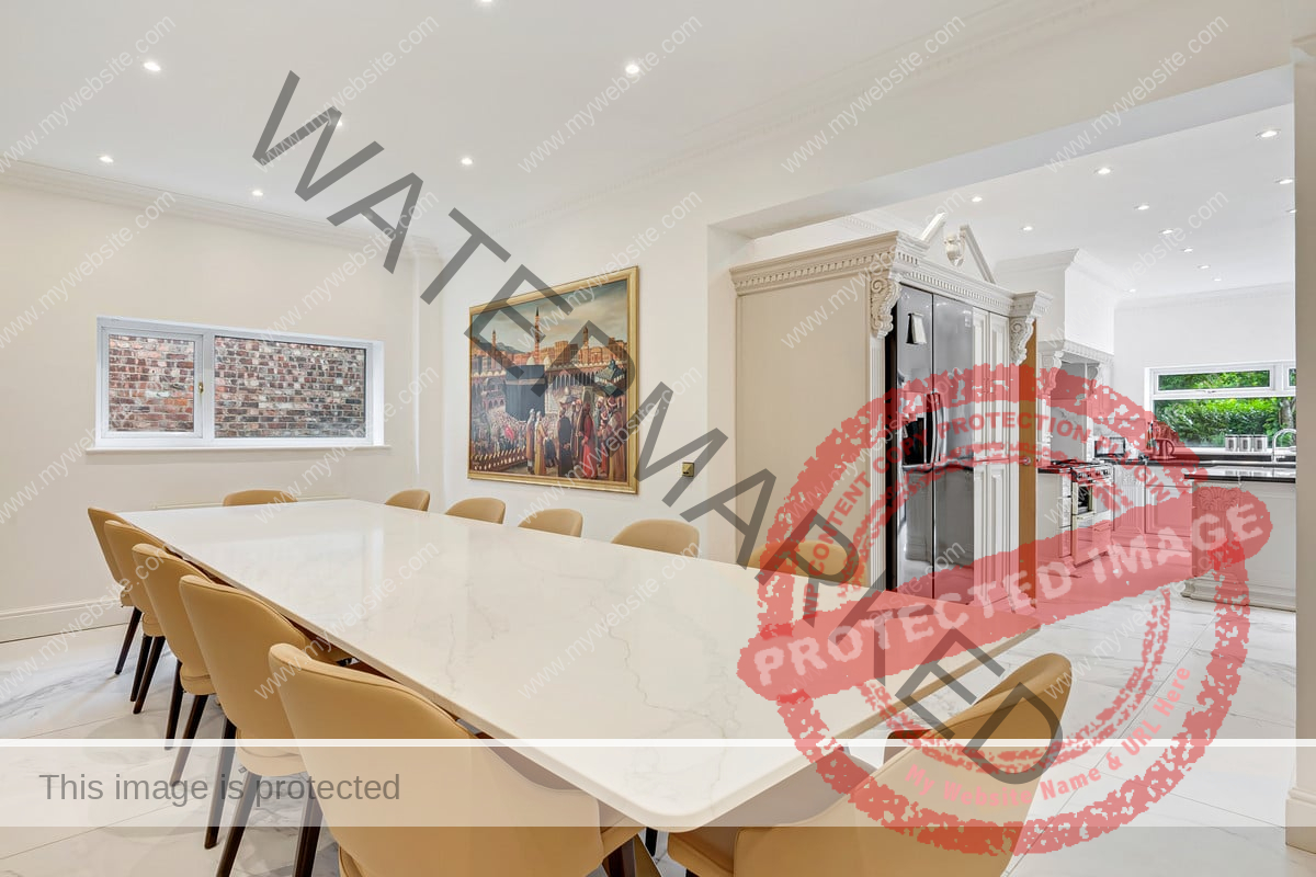 Upon arrival, the property is accessed via electric vehicular and pedestrian gates, leading to an ornamental pond and bridge to the formal entrance. Inside, a grand reception hallway with tiled flooring and intricate ceiling details sets the stage for this splendid home. The formal sitting room features tiled flooring, curved windows, and a full height window to the rear garden and connects to an additional sitting area/games room with double doors to the garden. There is also a second reception room at the front of the property.