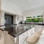 The open-plan kitchen/dining room is a standout feature, with enough space to comfortably seat 20 guests. The kitchen area boasts a range of wall and base units, granite worktops, space for a fridge/freezer, an integrated dishwasher, space for a range style cooker and a sliding door leading to the garden. Adjacent to the kitchen is a utility room housing the gas central heating boiler, an additional room with plumbing for a second kitchen and a fully tiled W.C.