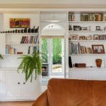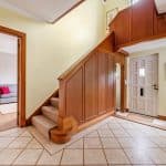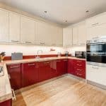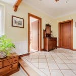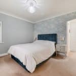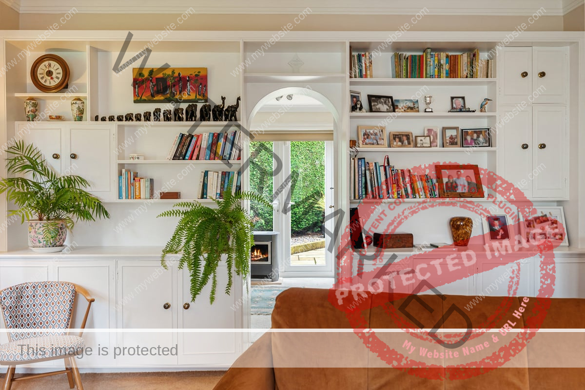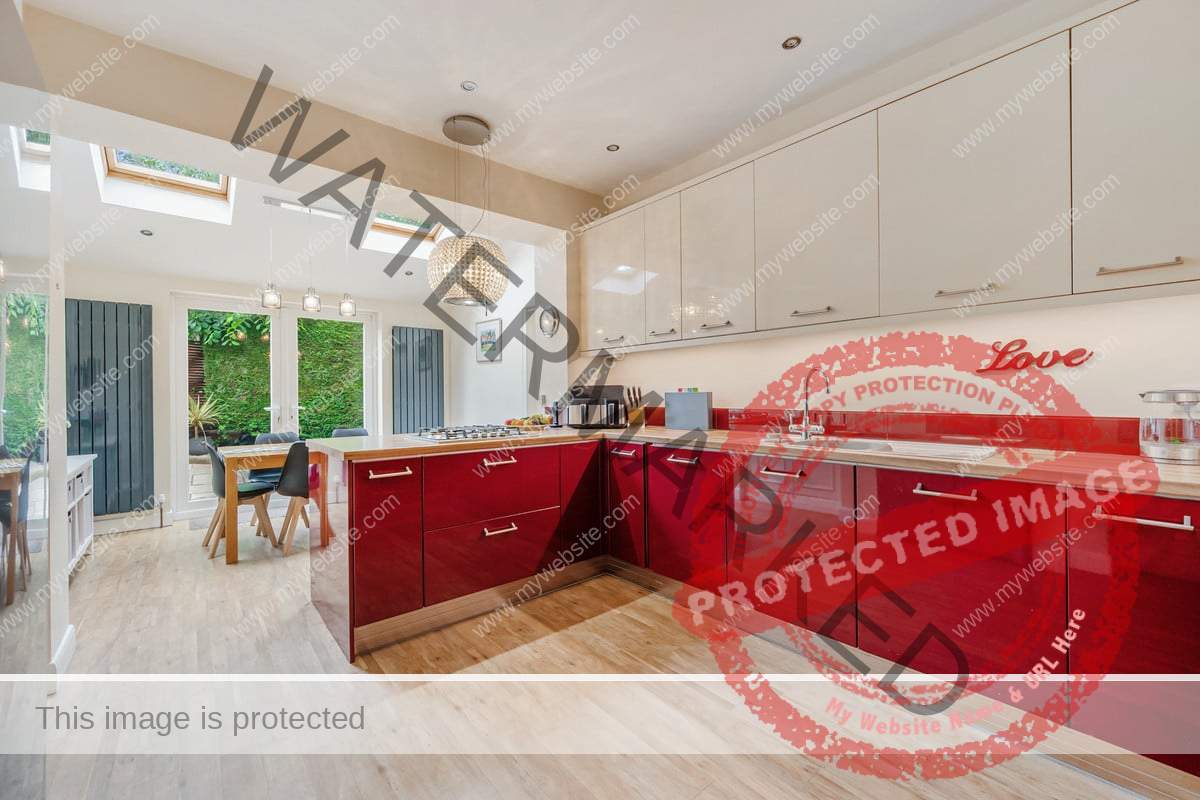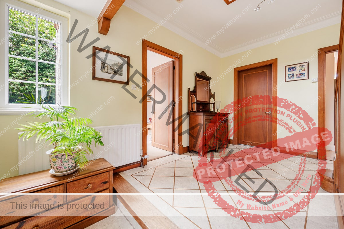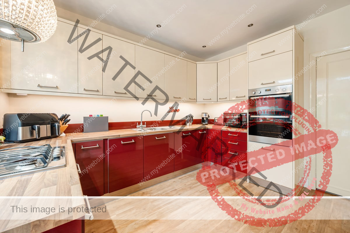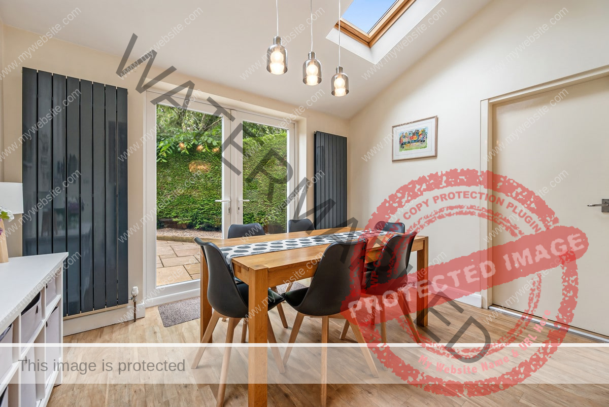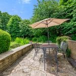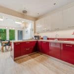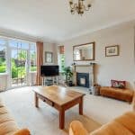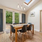 The kitchen is flooded with natural light from two skylights and double patio doors that lead to the rear patio. It is equipped with an AEG 4-burner gas hob with overhead carbon filter, Zanussi double ovens, an integrated dishwasher and space for a double fridge freezer. The kitchen also retains its original pantry and glass cabinet doors, complimented by fitted cupboards and wood-effect worktops. Situated off the kitchen is a practical utility room with a single door leading outside, featuring ample space for both a washer and dryer, a sink, and the potential to add a dog shower area.